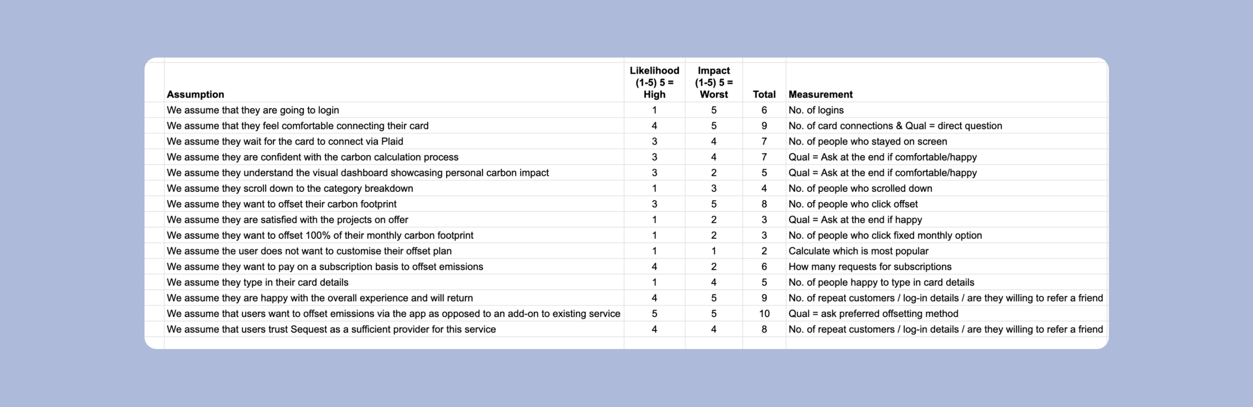 It was a great way for us to really focus on what are the major risks at play. That way we could try and mitigate the risk through design. Our plan was to measure these assumptions in 10 user tests. We would then count the number of people who passed a various stage. Then we would follow up with 'why' they did a certain action after the test.
