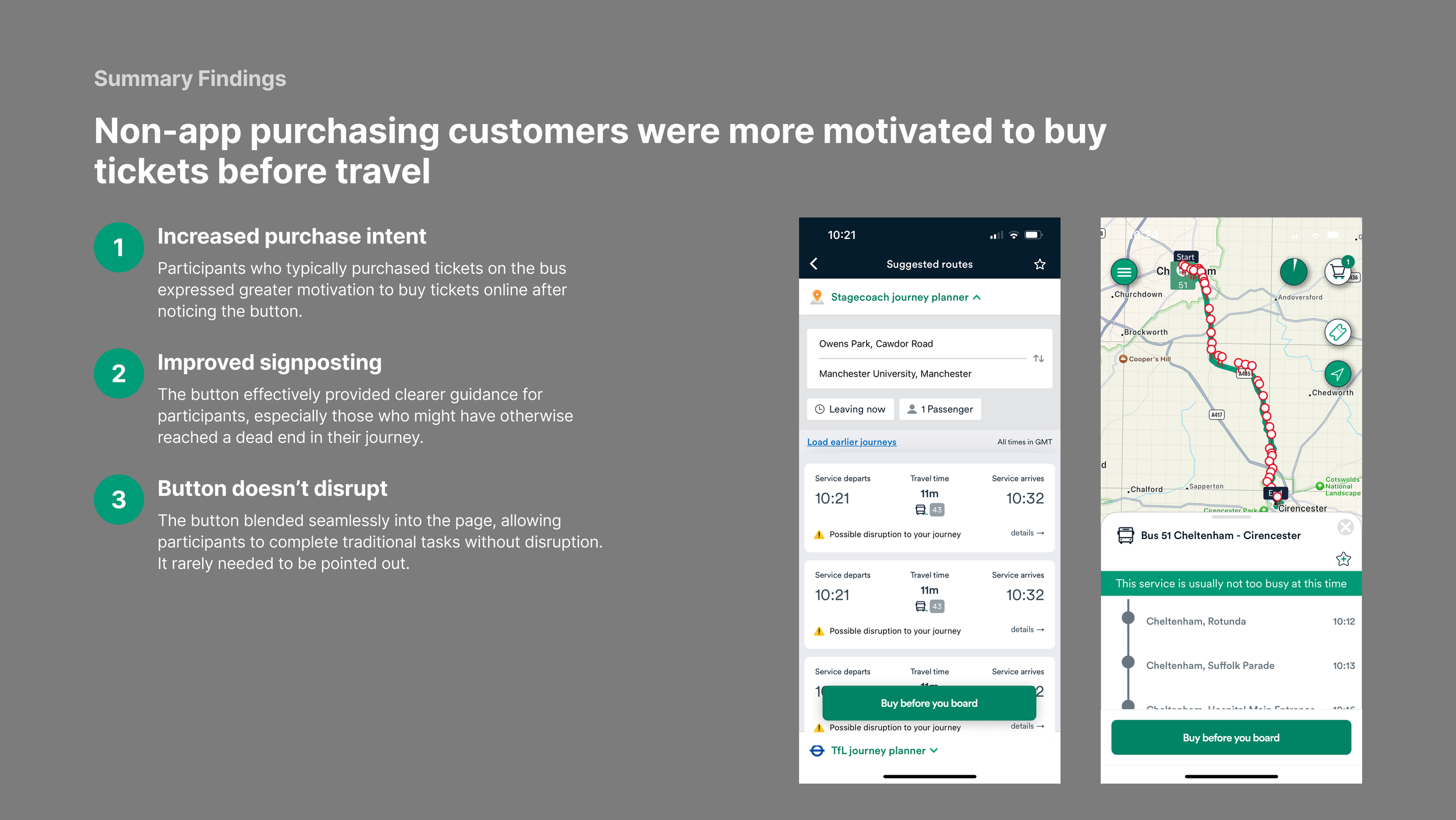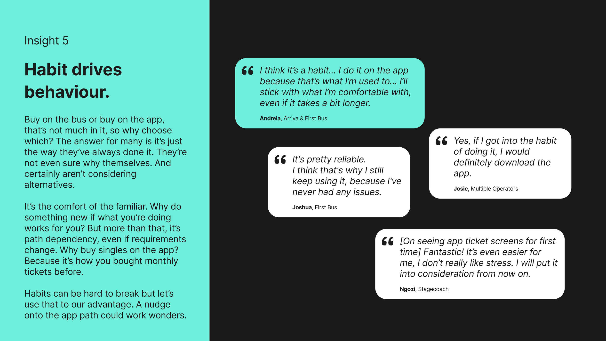 It helped us visualise the real world journey people take when using the bus and gave us a clear sense of where we were seeing clusters of friction, behaviour patterns, and opportunities to act.