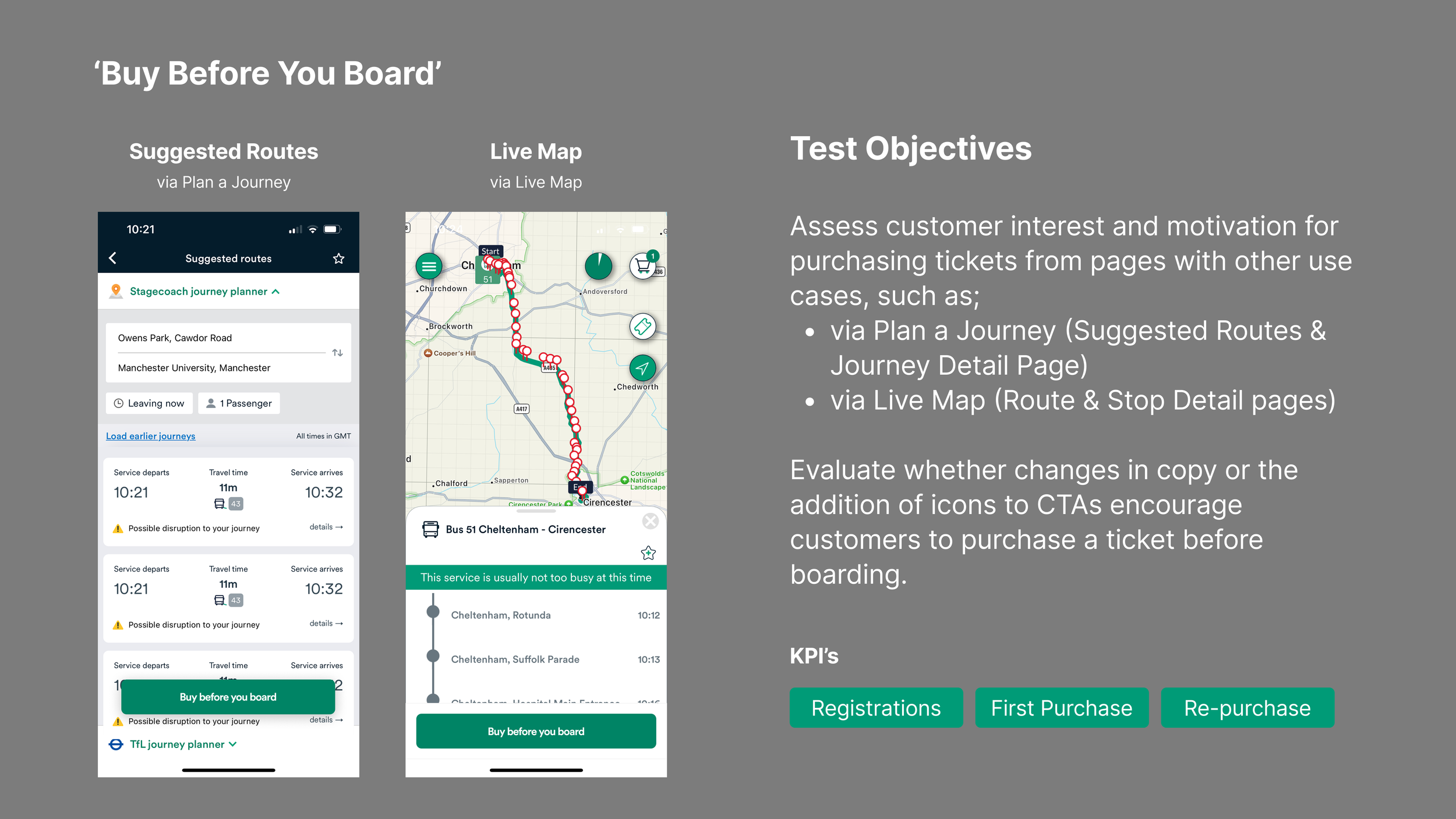 Users often didn’t make it to the ticket section, especially in the journey planner and live map, where their focus was elsewhere. We wanted to introduce a clear ‘Buy Before You Board’ button in those areas to gently nudge users at the right moment, without disrupting their flow.